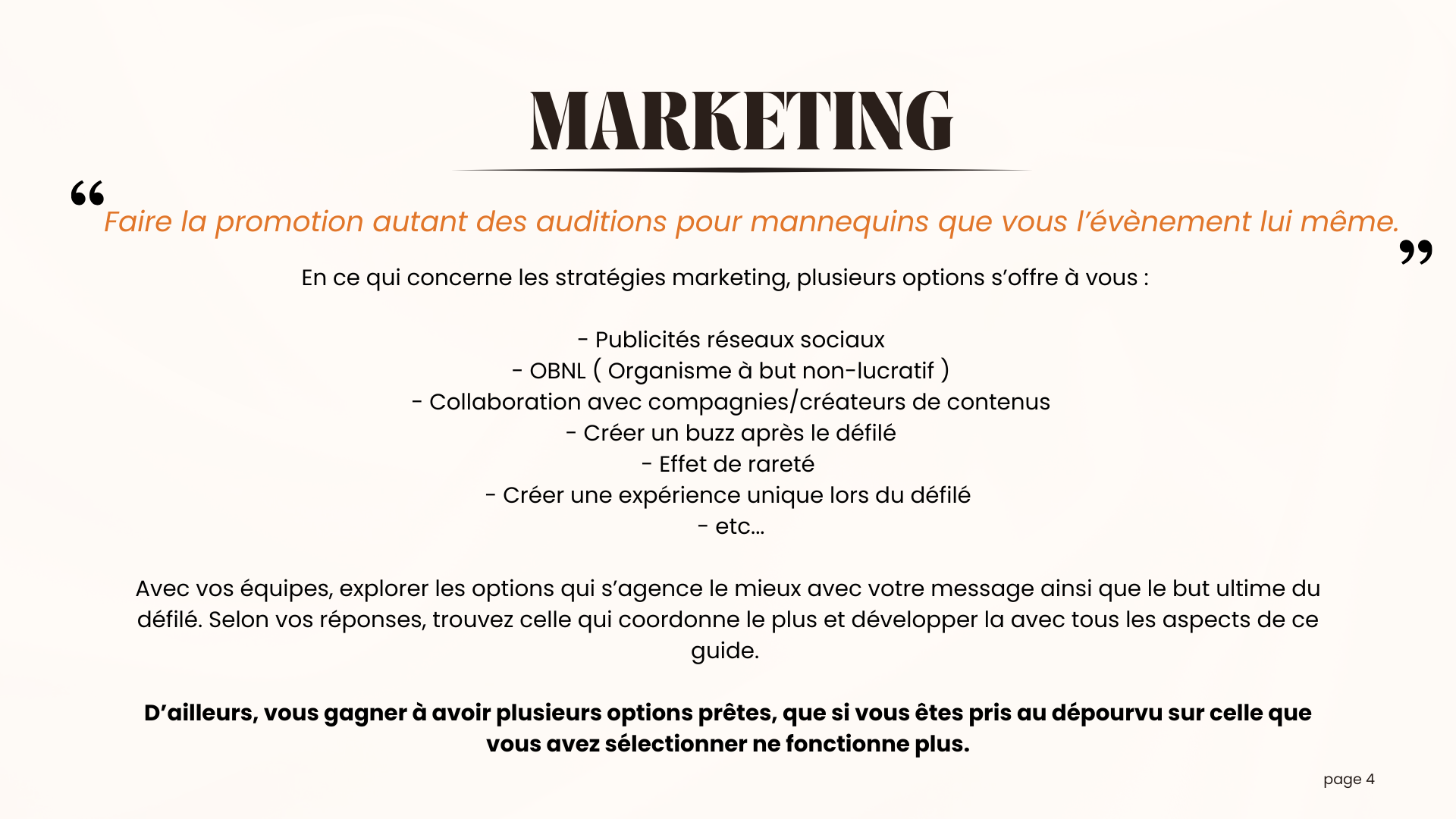 Trouver tout ce que vous avez besoin pour concevoir un défilé réussis de la sélection des mannequins aux stratégies Marketing.